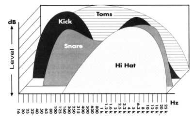 Взгляните на график 1. На нём изображён частотный спектр ударной установки. Обратите внимание, что этот самый спектр перекрывает весь звуковой диапазон. Что это значит? А то, что если бы все барабаны гремели одновременно и неприрывно, они заняли бы весь частотный диапазон и больше ничего в партитуру впихнуть бы было невозможно... Нет пожалуй впихнуть бы было можно, но в результате получился бы один шум. Слава Богу ни один аранжировщик не пришёл к идее написать такую партитуру. Поэтому в каждый отдельный момент времени звучания аранжировки мы слышим только один-два инструмента из всей ударной установки и остаётся место для других инструментов.